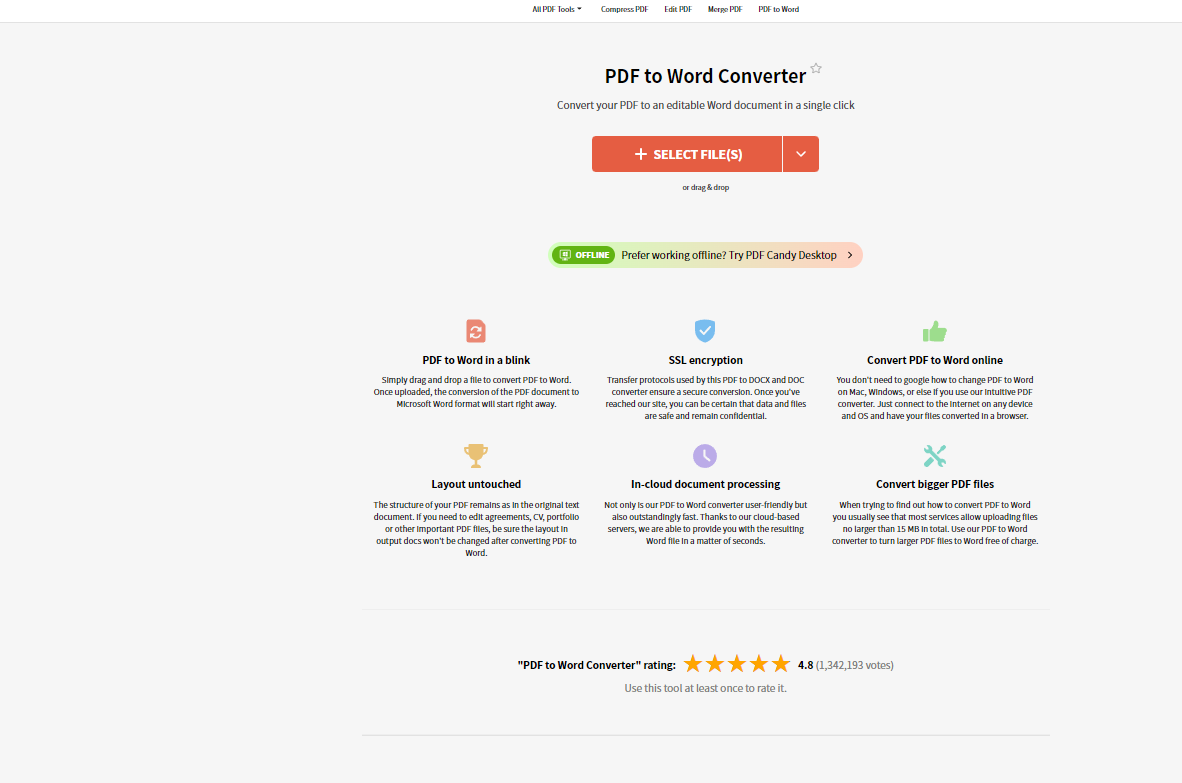 这是一款功能十分全面的在线工具,除了能将PDF转换为Word外,还支持PDF合并、拆分、压缩等多种操作,为用户提供了一站式的PDF处理解决方案。它的转换速度快,文件质量高,并且完全免费使用,无需下载安装。此外,PDF Candy支持从Google Drive和Dropbox等云存储上传文件,方便用户随时处理存储在云端的PDF文件。