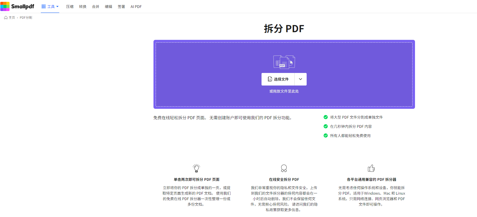 第二步:点击“选择文件”上传需要拆分的PDF,也能直接拖拽文件到网页;