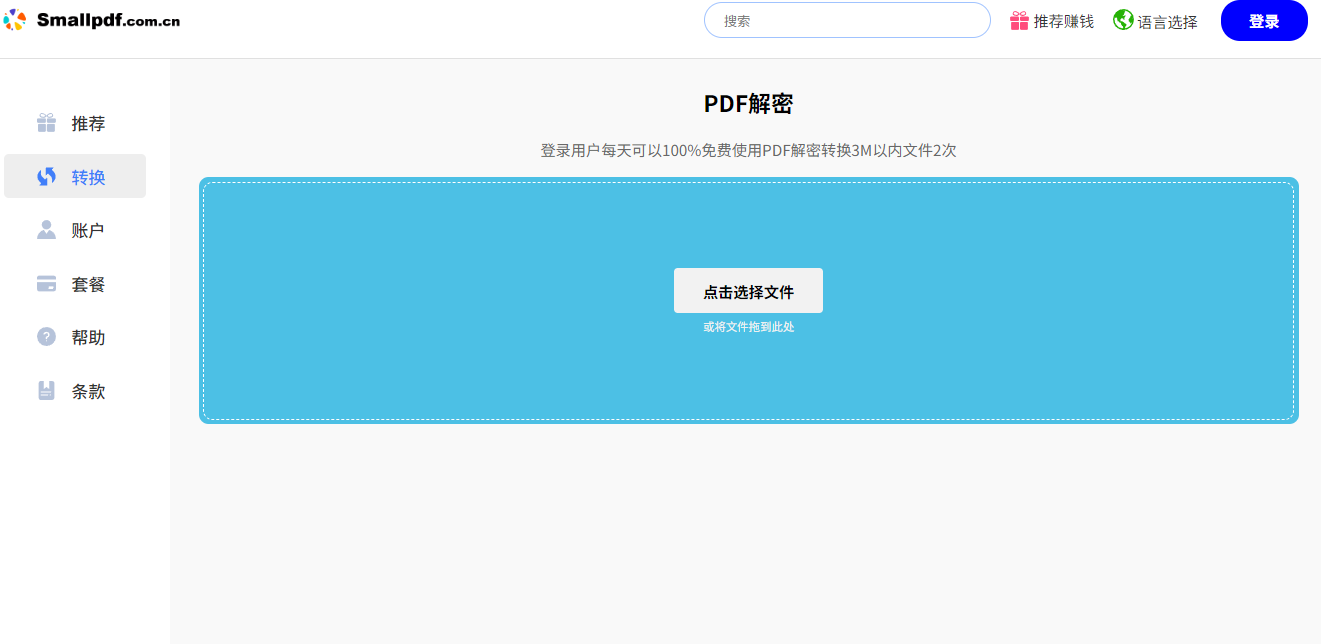 第二步:接着点“选择文件”把带密码的PDF上传,或者直接拖到框里也行;