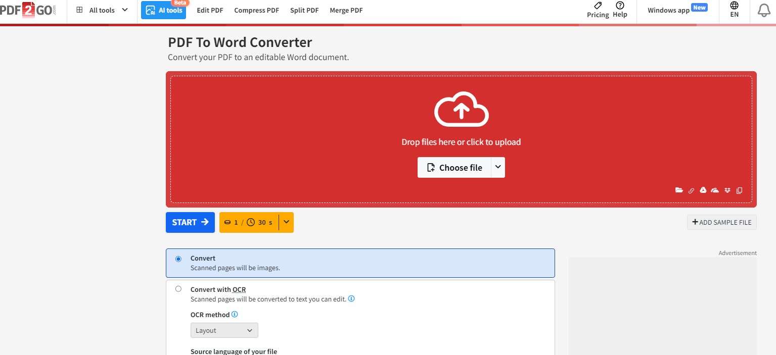 第一步:打开PDF2GO官网,选择“PDF转Word”,点击上传按钮添加扫描件。