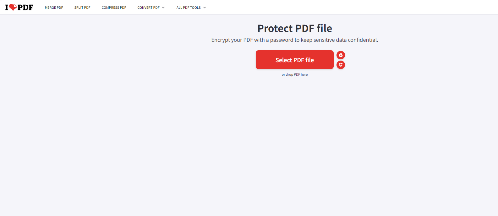 第一步:打开官网“加密PDF”页面,拖放或选择需要加密的PDF文件。