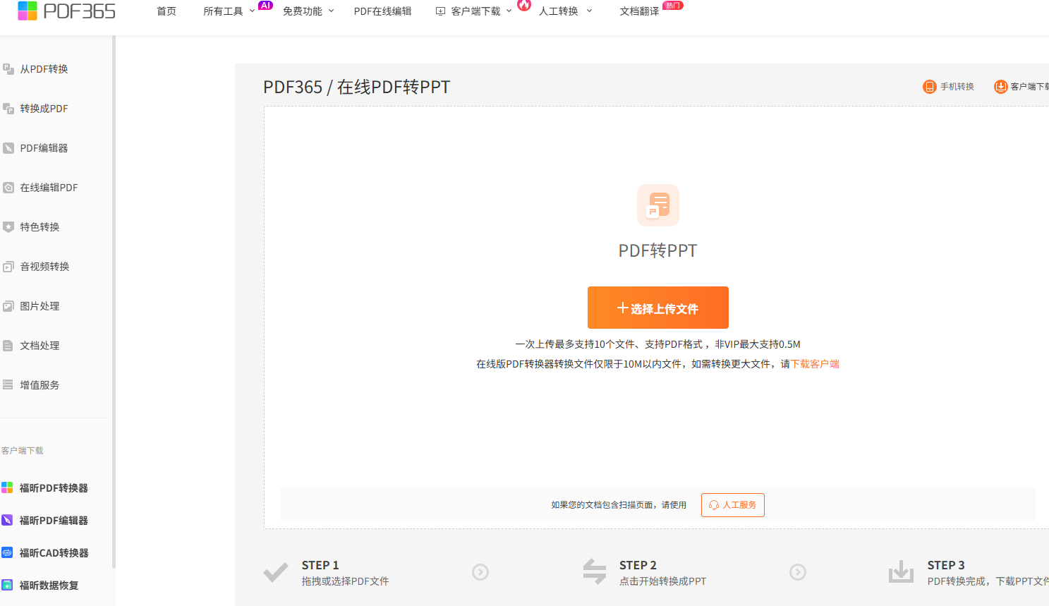 第一步:打开福昕PDF365官网或下载客户端,进入“文档转换”模块,选择“PDF转PPT”功能并上传PDF文件;