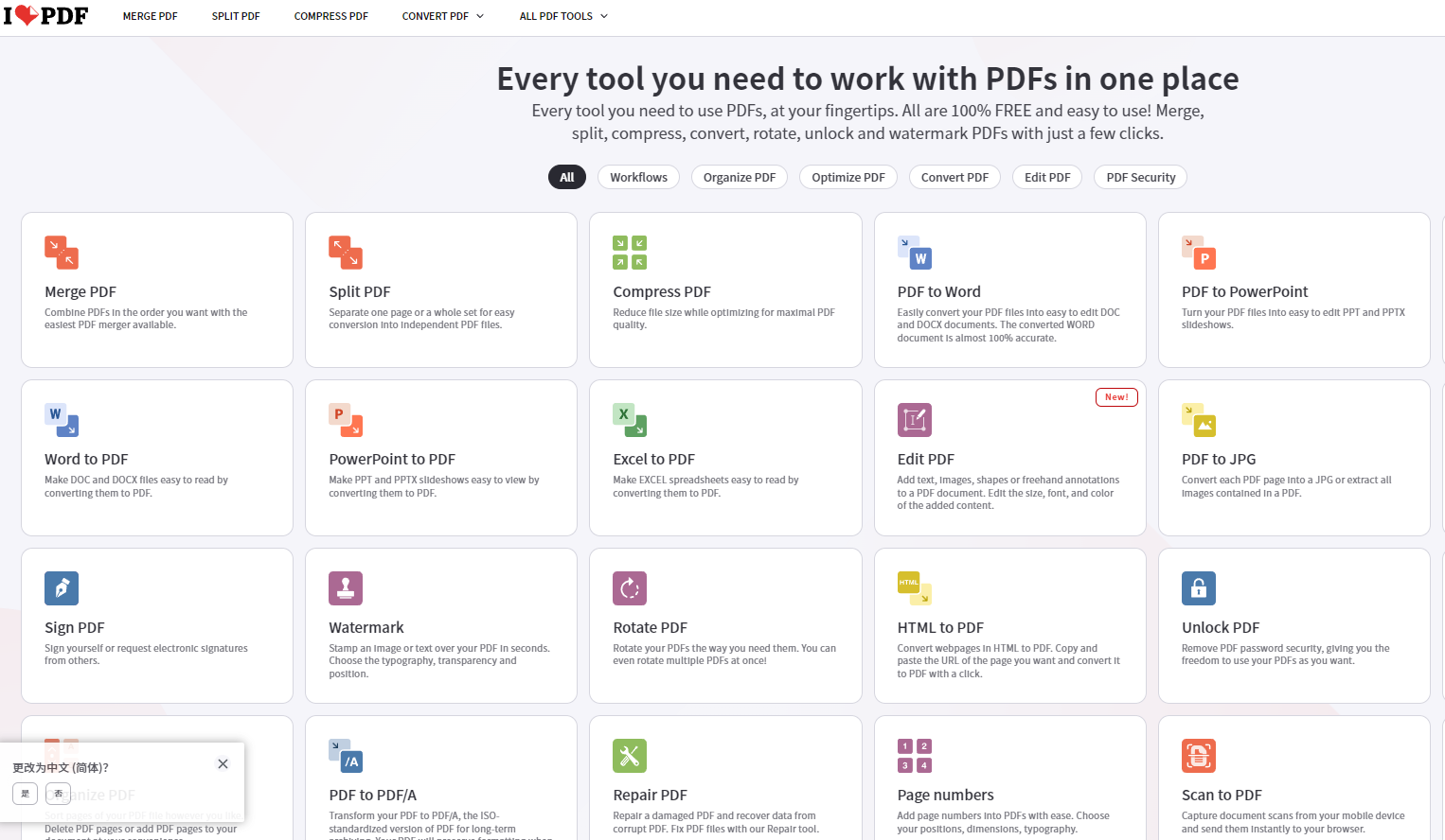 第一步:进入iLovePDF官网,点击“PDF转Word”功能模块。